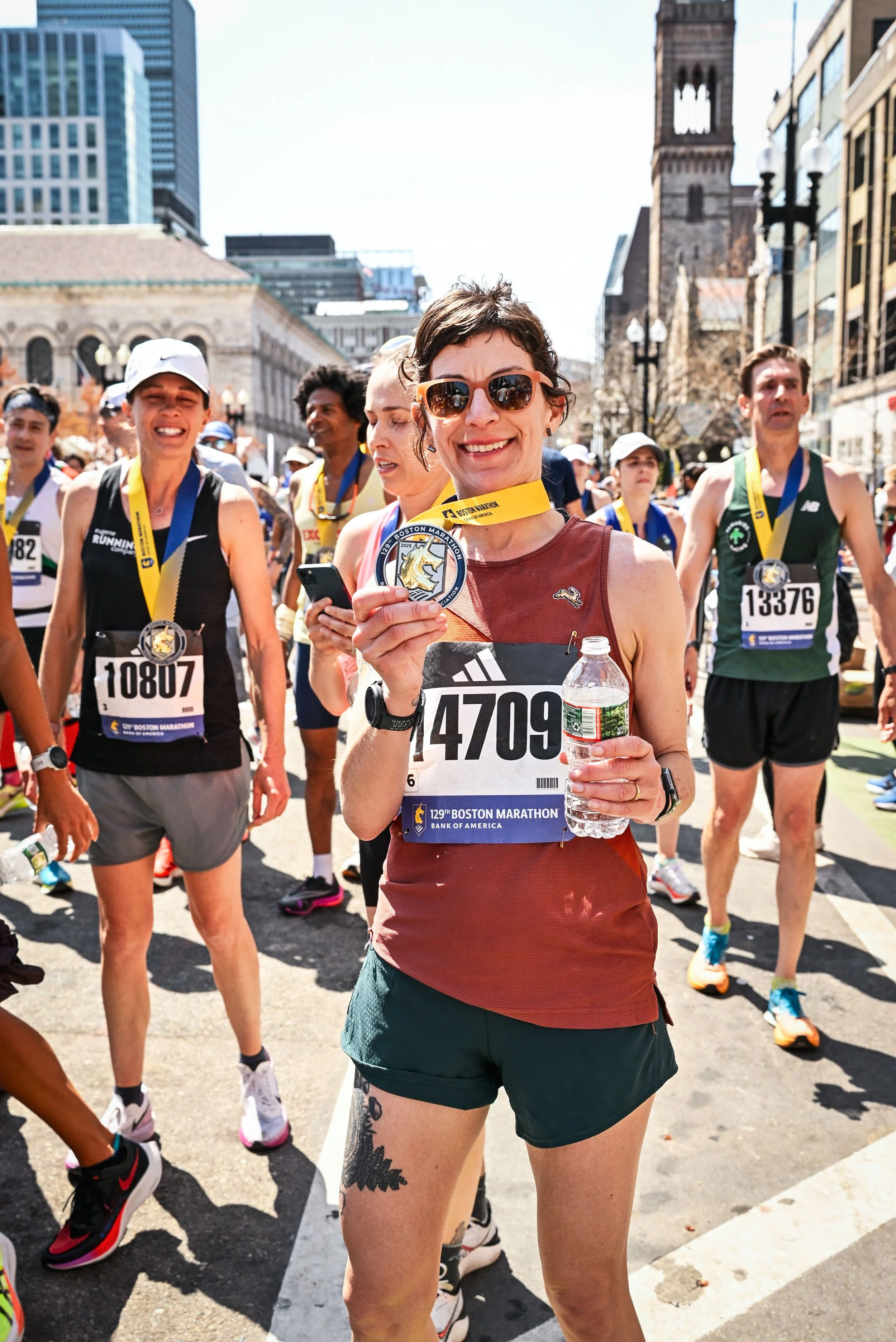 4:27 and a story of perseverance for Jennie! Coached by Coach Sarah, Jennie started this marathon cycle dealing with a calf injury, but she adapted with creative cross-training, PT, and strength work. She stayed positive and focused on getting to the start line healthy, reframing expectations along the way. On race day, Jennie ran smart, enjoyed the journey, and embraced the energy of Boston. Despite a short running build, she finished strong - a true testament to her resilience and determination. Way to go, Jennie!